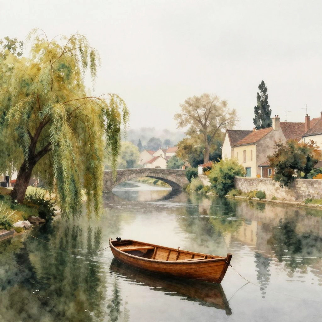 Francesa river scene with a small wooden boat floating gently on calm waters, willow trees overhanging the banks, distant view of a stone bridge and old village buildings, soft morning mist, serene and peaceful mood, watercolor style artwork.