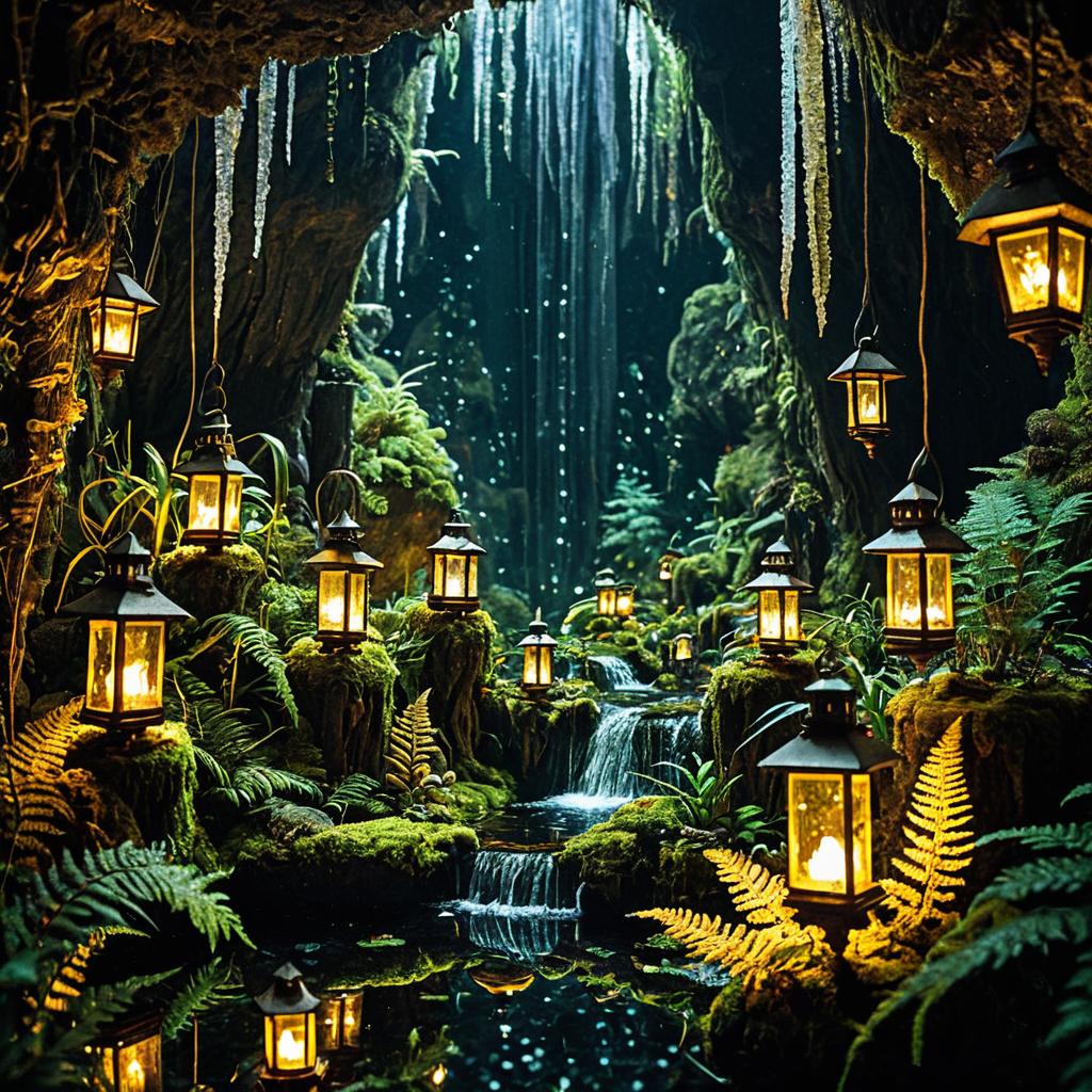 A detailed fantasy scene inside a crystal cave featuring glowing golden lanterns suspended among green moss and ferns. The cave has shimmering crystal stalactites and a clear waterfall pond reflecting the serene environment. The setting evokes a magical woodland inhabited by tiny sprites with intricate foliage and warm lighting throughout.