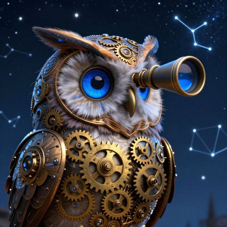 In a steampunk-inspired digital artwork, a clockwork owl adorned with intricate gold gears and a telescope-fitted eye gazes intently at the starry night sky, its vibrant blue eyes and fluffy feathers contrasting against the celestial backdrop as it maps constellations and whispers forgotten myths with each blink.