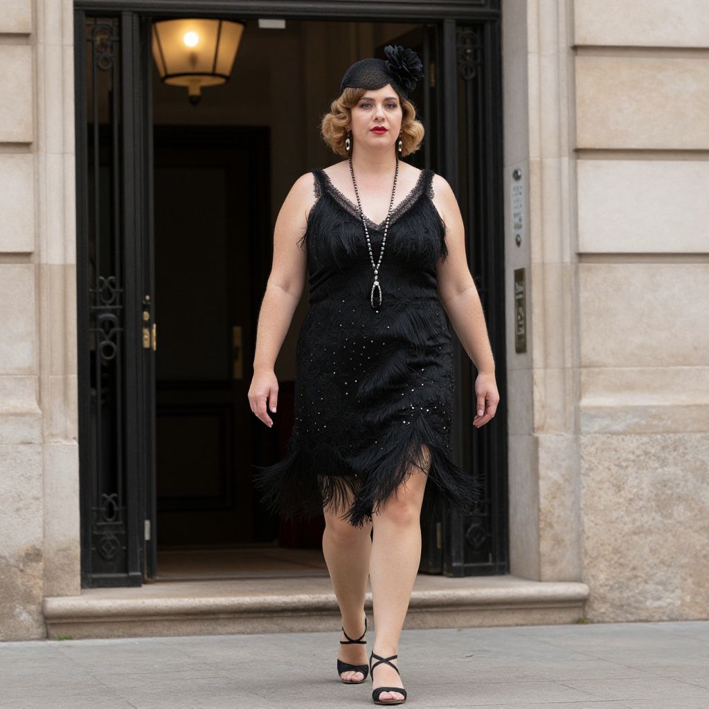 Flapper Costume Plus Size, woman in a black dress and hat walking out of a building
