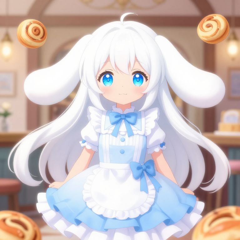 Cinnamoroll as an anime girl with long flowing white hair, big sparkling blue eyes, fluffy ears, wearing a pastel blue and white frilled dress, surrounded by floating cinnamon rolls in a whimsical fantasy café setting, soft glowing lighting, detailed background.