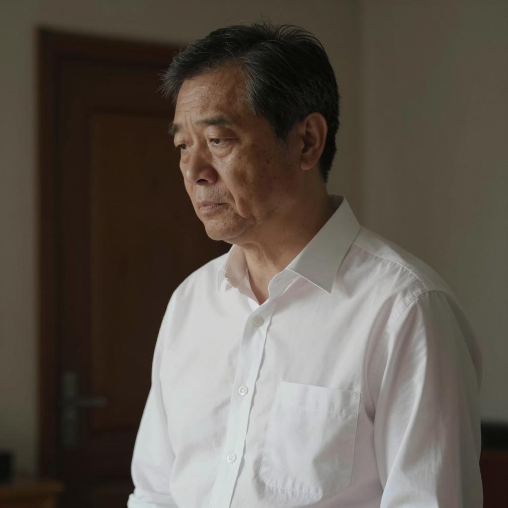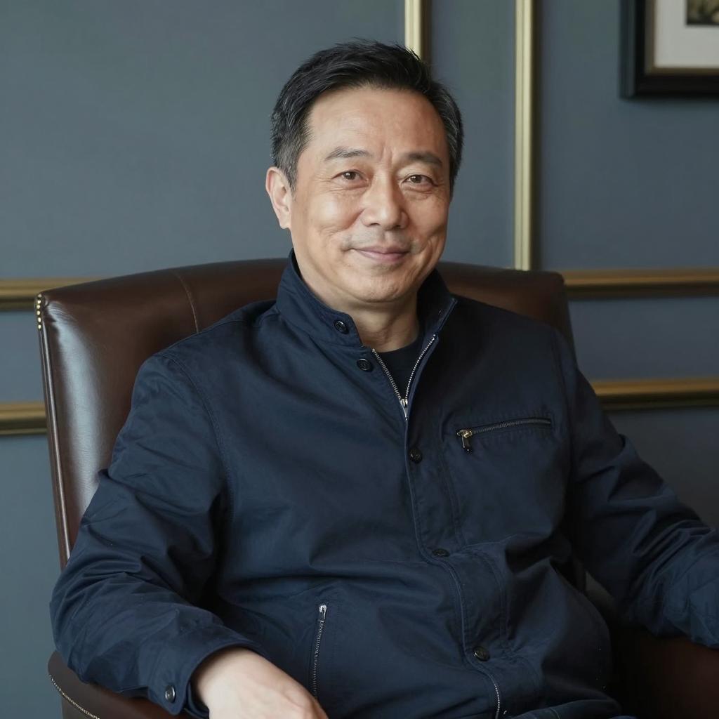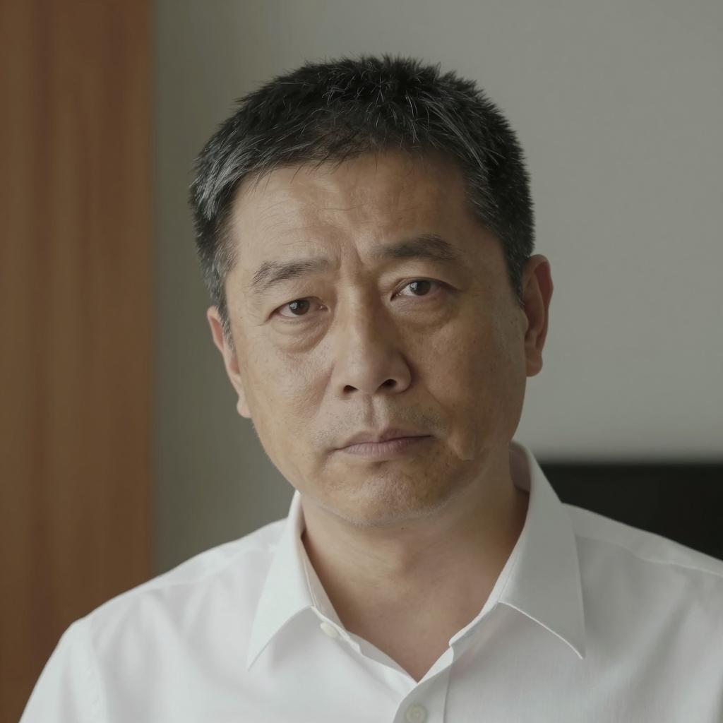 A middle-aged East Asian man with slicked-back black hair, wearing a light-colored button-up shirt paired with a dark vest. He is seated at a wooden table, hands clasped, with a slight smile, looking to the right. The background is dimly lit with an ornate wooden chair and a patterned glass cup visible on the left side.