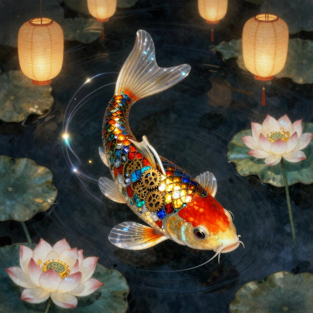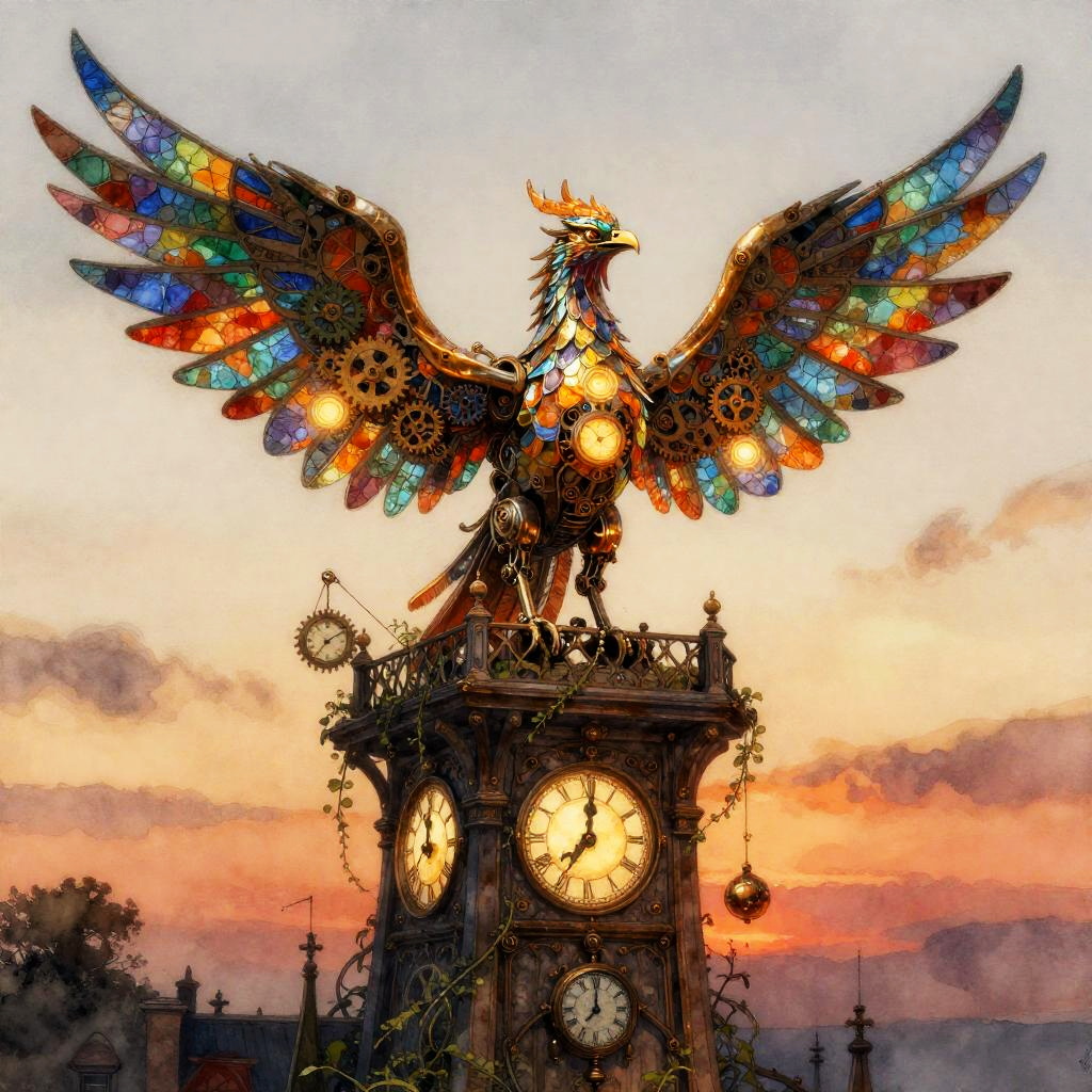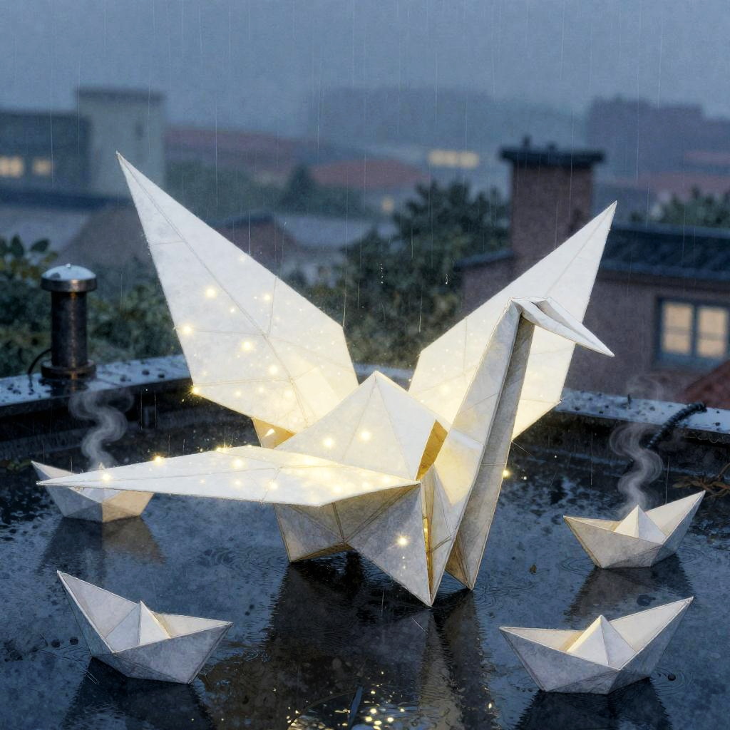 An artistic depiction of an origami crane of moonlight, with folded paper wings that ripple like silk, edges dusted with stardust and faint inked constellations, a soft internal glow, in a rooftop temple at dawn with drifting lanterns and a breeze carrying hundreds of paper cranes across tiled eaves, created in ink-wash and digital composite with delicate papercraft textures, luminous rim-lighting, and subtle grain, serene and magical