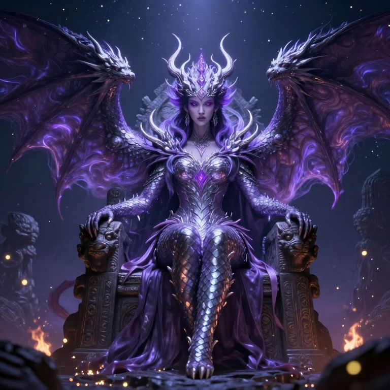 An ancient dragon queen with iridescent purple and silver scales, wings unfolding like a storm of wind and light, sitting on a throne carved from living rock beneath a starry sky, fierce expression, dark violet eyes, a crown of glowing runes on her head, surrounded by fireflies and ancient stone guardians, mystical fantasy atmosphere, high-resolution realistic lighting