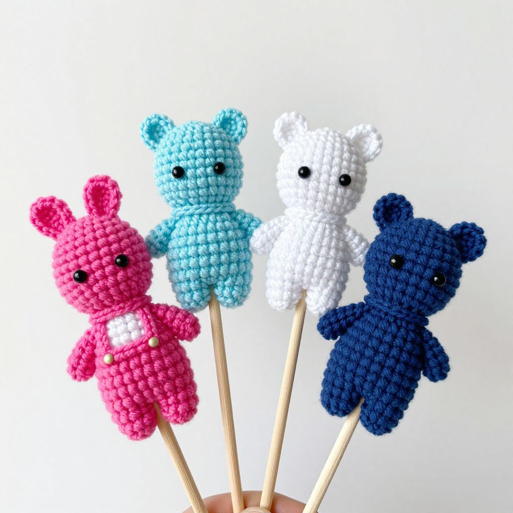 Photograph of four crocheted teddy bears, pink, blue, white, and dark blue, on wooden sticks, with black eyes and small