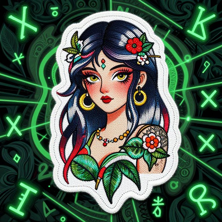 Embroidery Lace Neo traditional style tatto girl Create a trippy, psychedelic, and magical cartoon that immerses background patterns, runes, neon, symbols, lines, green,