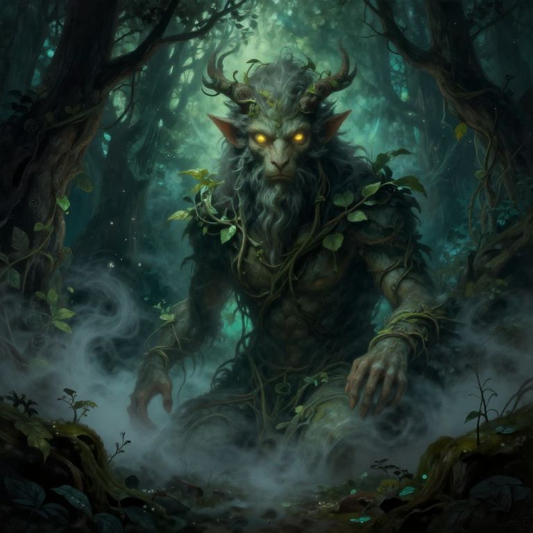Digital fantasy artwork of a fierce, glowing-eyed, horned forest demon with dark fur, vines, and leaves, emerging from misty woods.