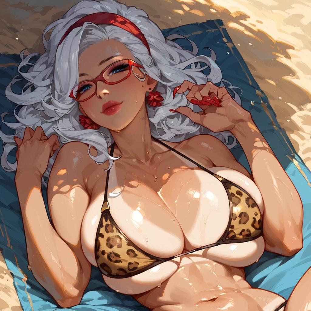 Score_9, score_8_up, score_7_up, score_6_up purah, white hair, hair ornament, red headband, red glasses, solo, outdoors, beach, sunbathing, oiled skin, tanlines, bikini, leopard print, mature female, curvy, smug