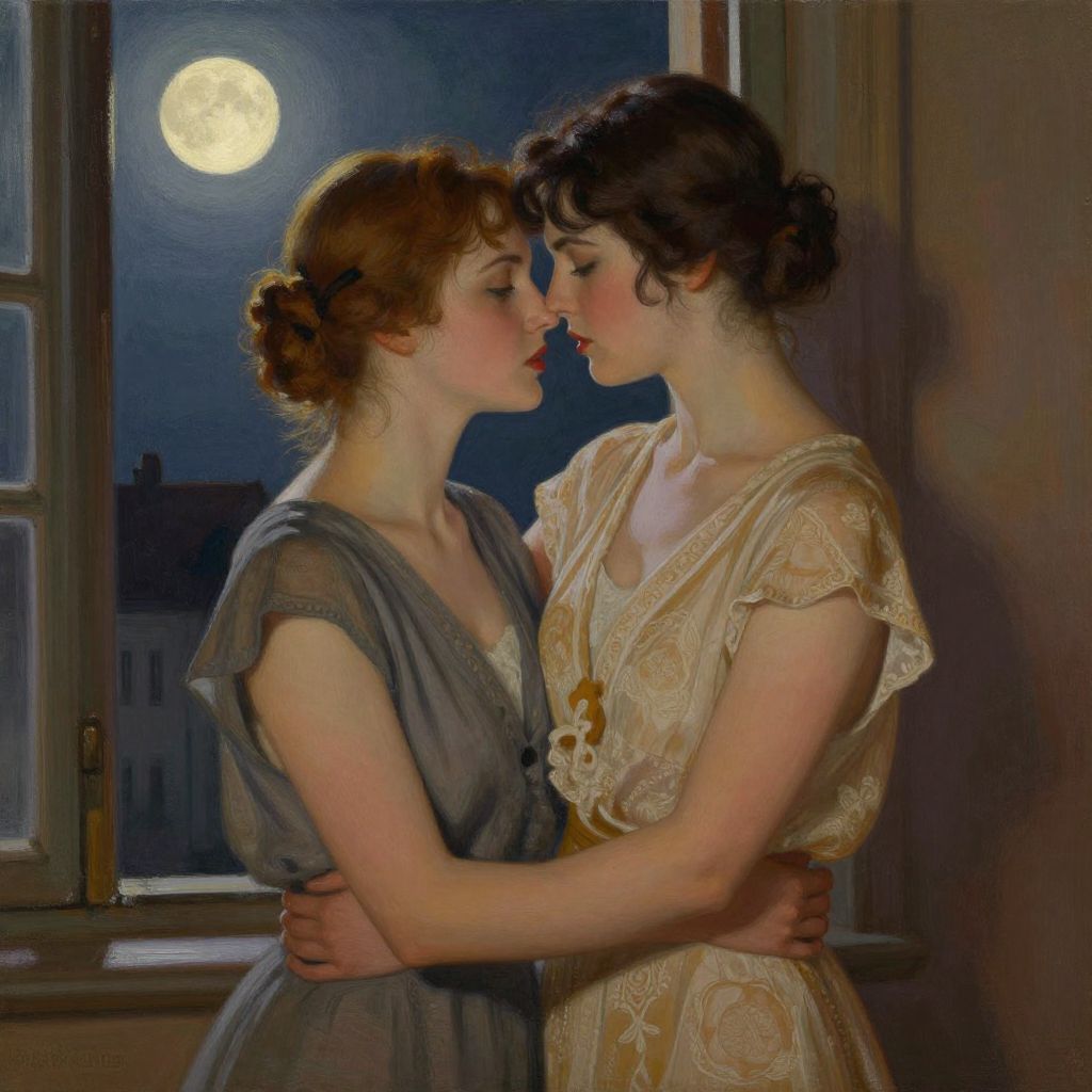 Painting of man kissing woman on cheek, romantic warm tones, soft brush strokes, impressionist style, intimate moment captured in a cozy indoor setting, gentle light, serene expressions