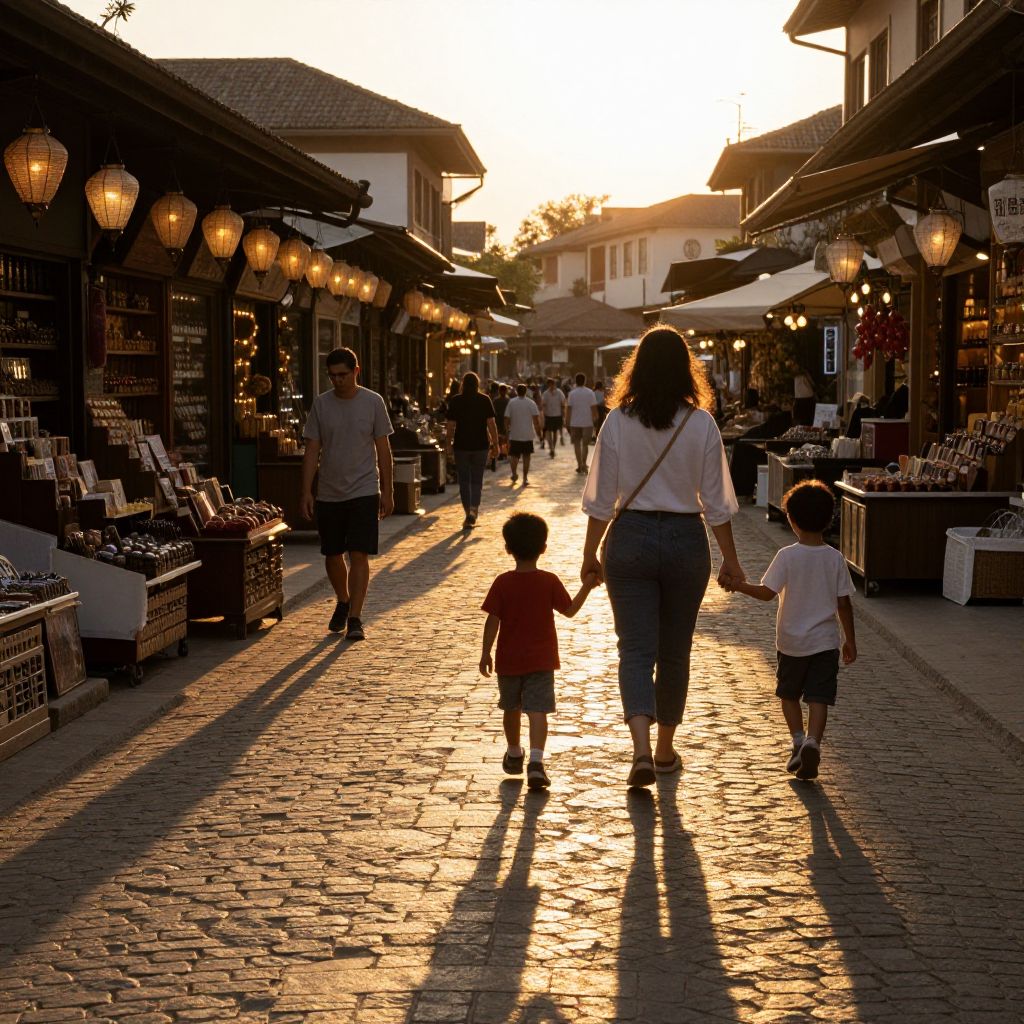 Sunset bathes a cobblestone street in golden light, casting elongated shadows as a woman leads two children hand-in-hand through a bustling marketplace lined with traditional shops and illuminated by hanging lanterns.