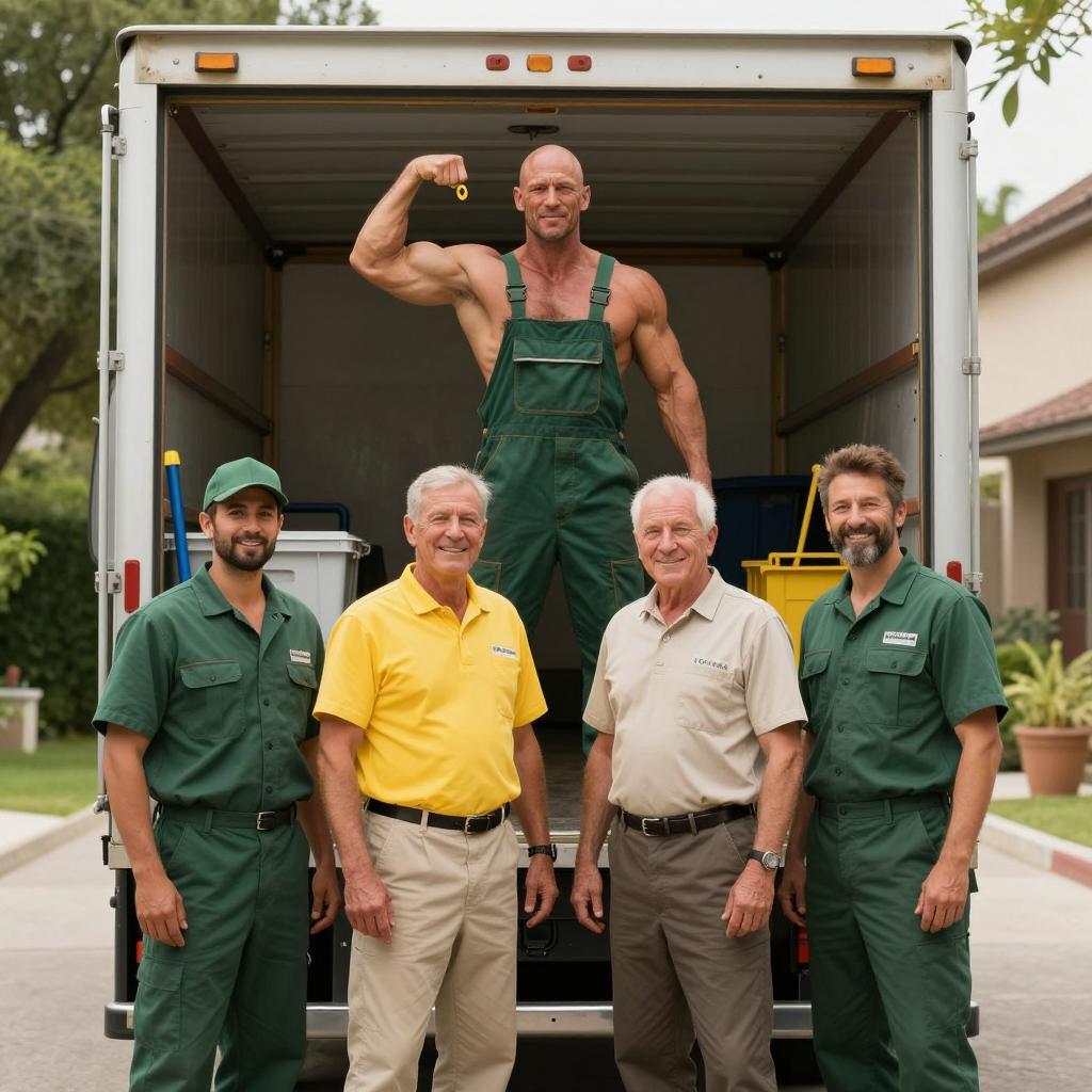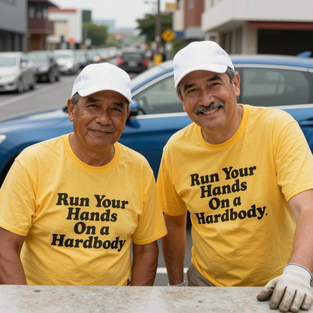 Two middle-aged men in white caps and yellow t-shirts with "Run Your Hands On a Hardbody" and blue car . Both men smile, one has a mustache. Background: urban street with cars, buildings. Man on left has tan skin, man on right has lighter skin. Both wear gloves. Textured fabric on table in foreground.