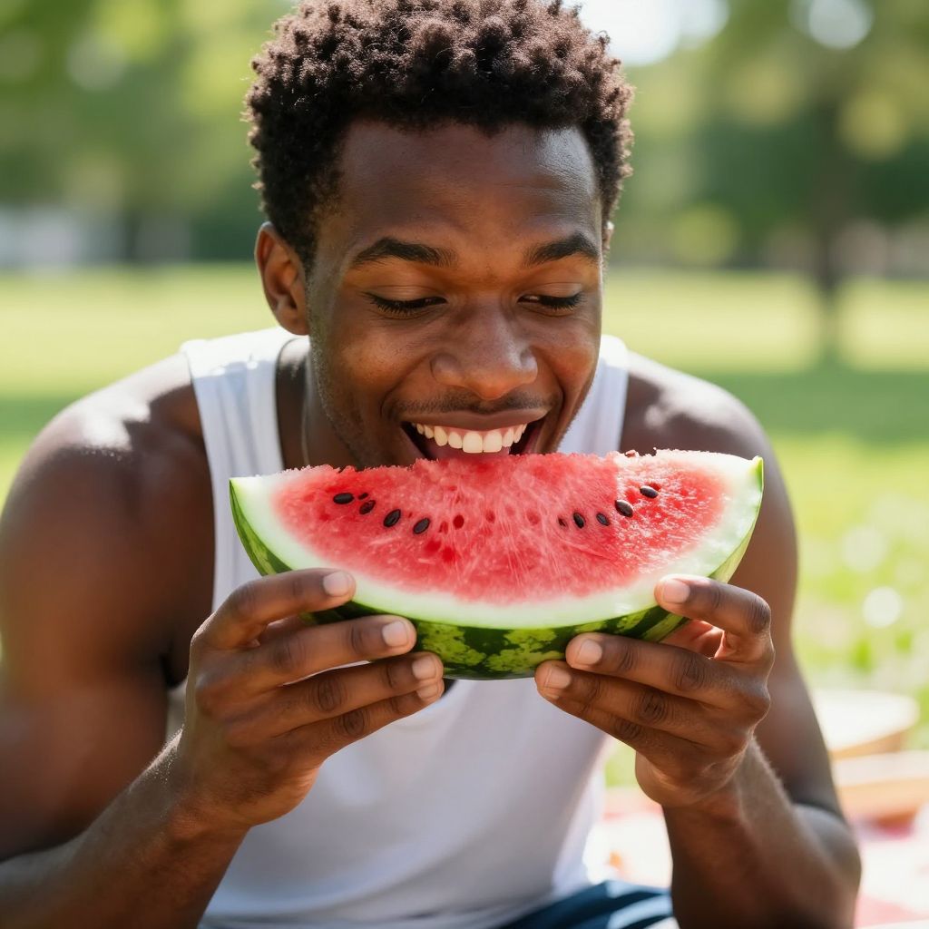 Black guy eating watermelon on a sunny summer day, vibrant colors, joyful expression, picnic setting, detailed watermelon slices, bright and lively atmosphere