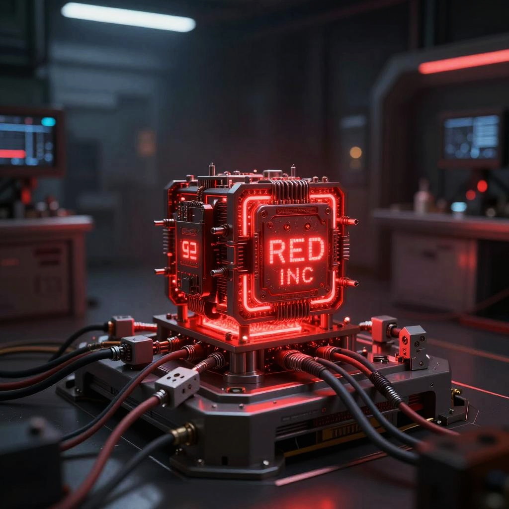 Red Deceive Inc AI core glowing deep red inside a high-tech laboratory, cables and data streams flowing around, sci-fi thriller mood, ultra-realistic digital art