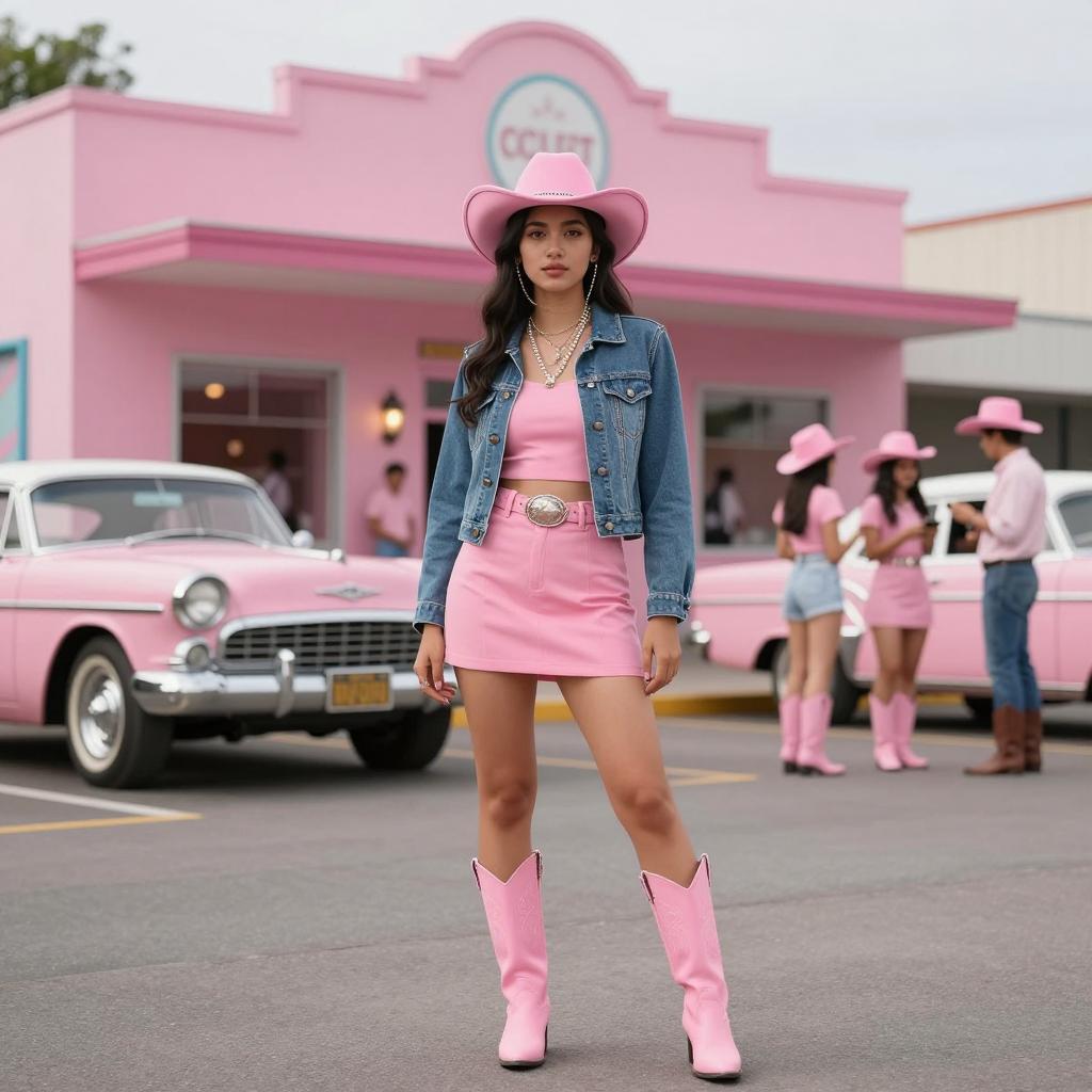 Young woman wearing a bright pink cowboy hat, pink skirt, pink boots, and a denim jacket stands confidently in front of a vibrant pink building with vintage-style decor. The background shows several other people also dressed in pink and vintage cars, creating a lively street scene with a retro western theme.