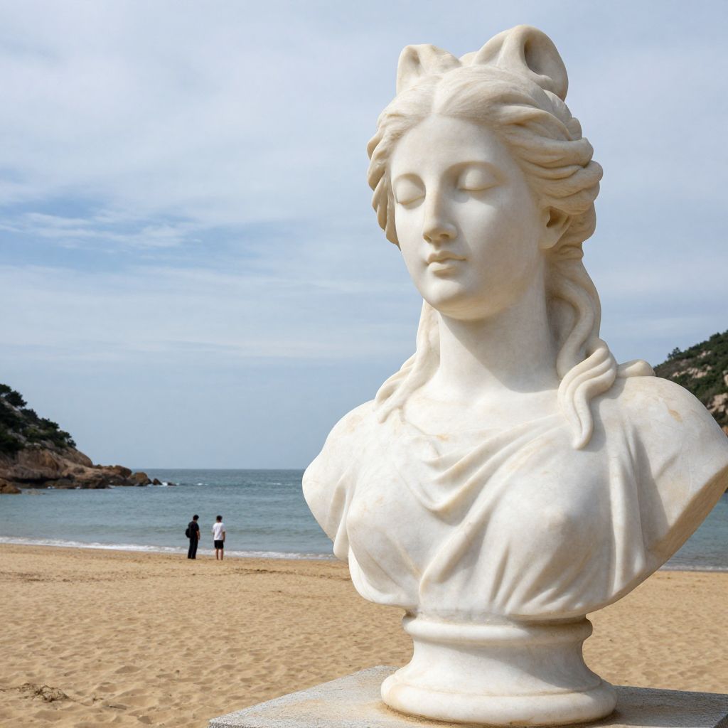 Photograph of a white marble statue of a serene, young woman with closed eyes and a calm expression, wearing a draped garment. She has wavy hair adorned with a small, cat-like headpiece. The statue is positioned on a sandy beach with a blue sky and calm sea in the background. Two people stand in the distance, one closer to the water and the other further back. The beach is bordered by dark green, rocky cliffs on the left. The overall mood is tranquil and picturesque.