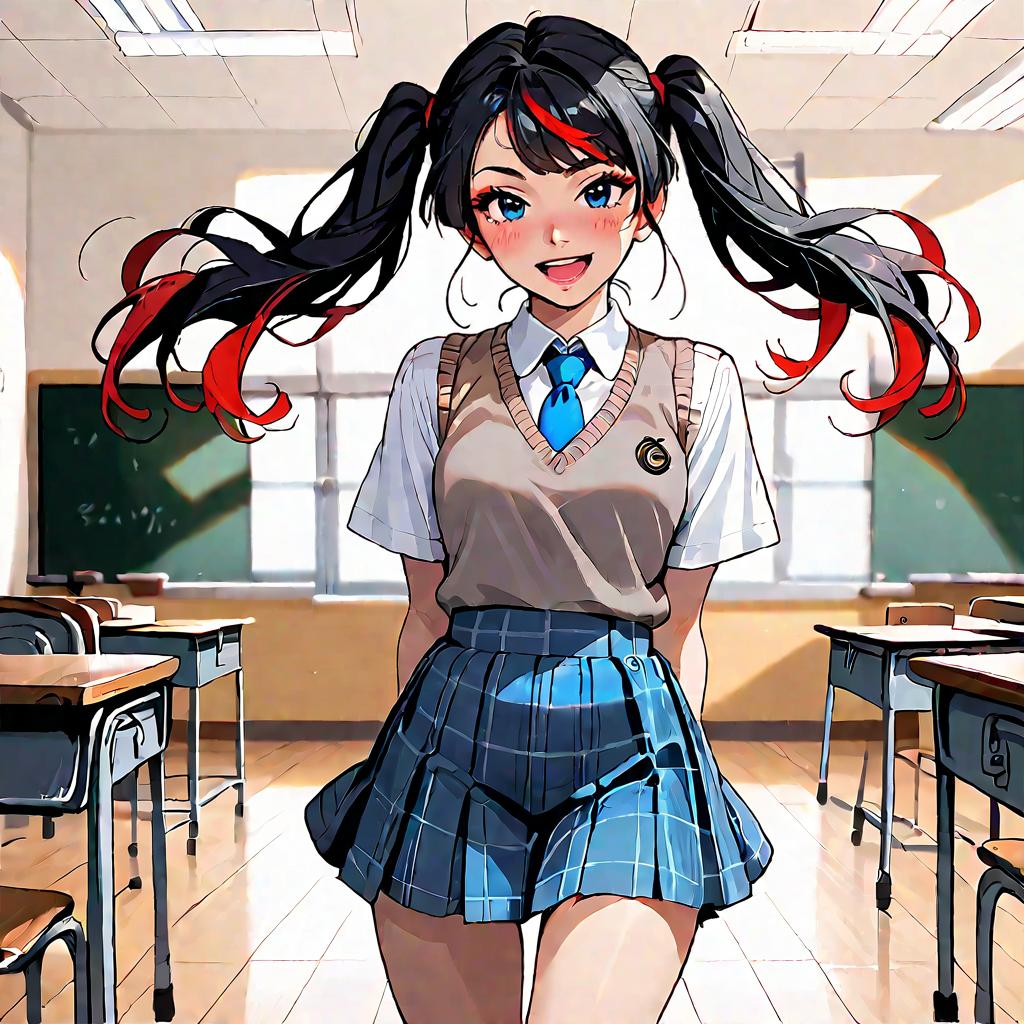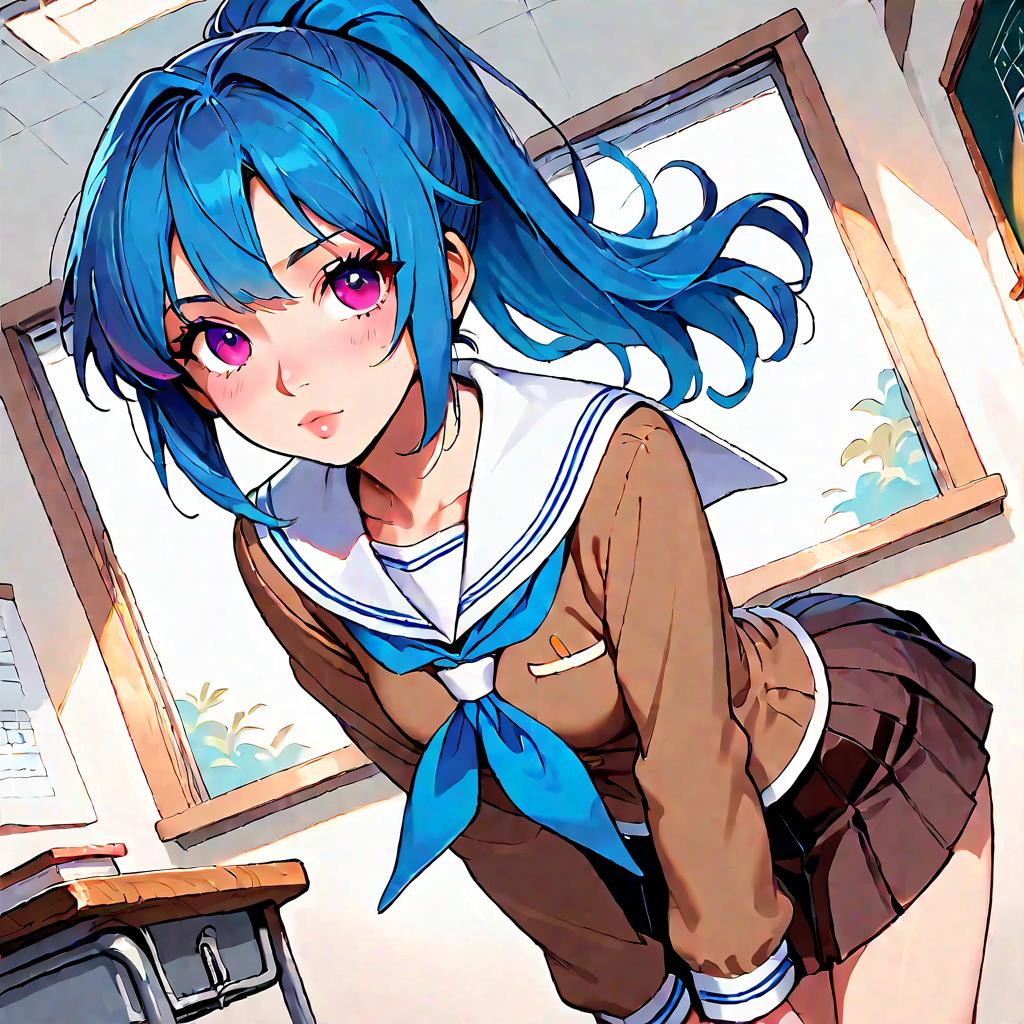 Anime Schoolgirl in Classroom with Blue Hair