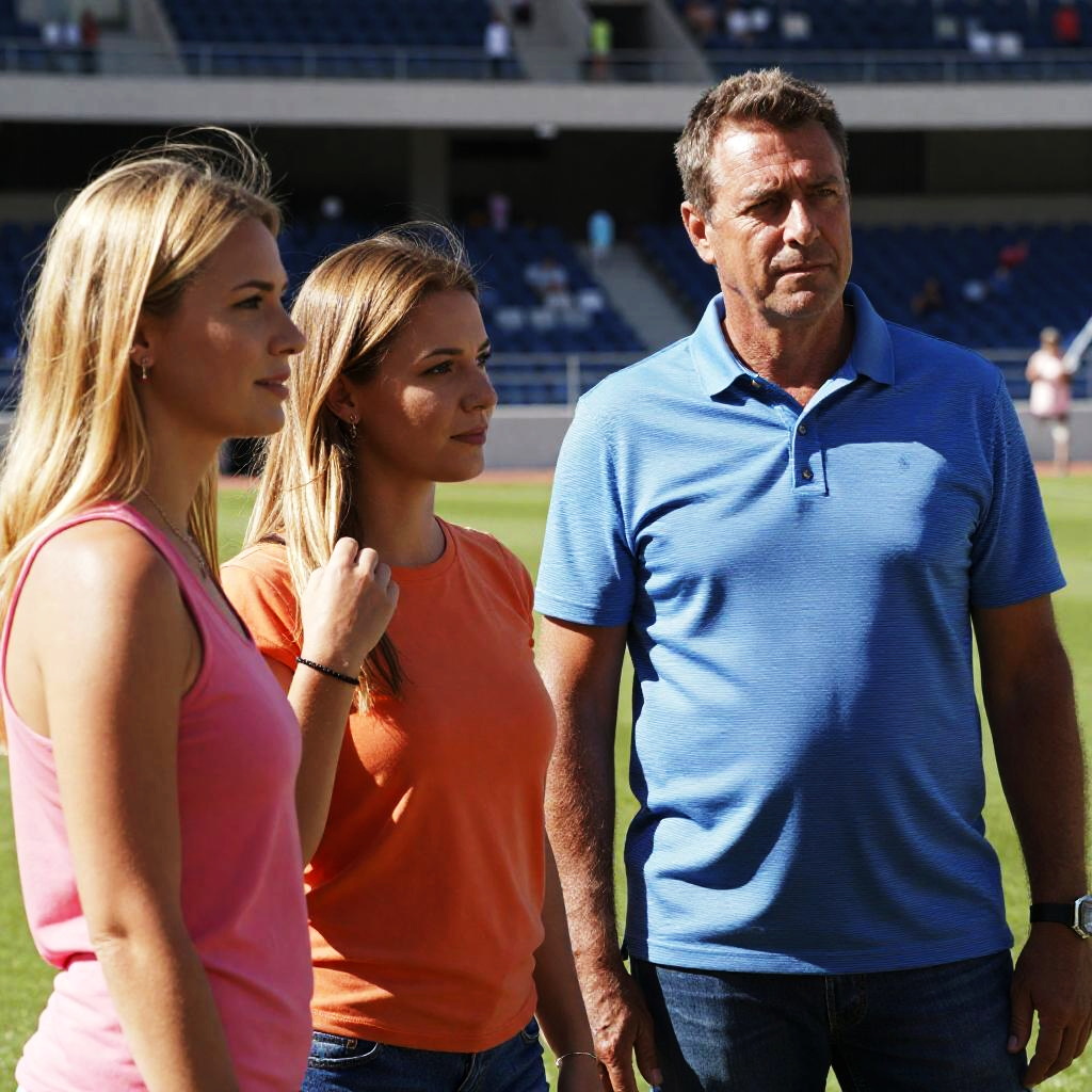 Photograph of three people standing outdoors near a stadium. A middle-aged man with short brown hair, wearing a blue striped polo, stands to the right, looking serious. Two women with long blonde hair, one in a pink tank top, the other in an orange shirt, stand to the left, the woman in orange touching her hair. Stadium seats and spectators in the background. Bright daylight.