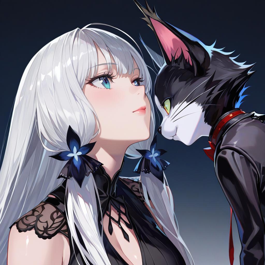 Anime-style illustration of a girl with silver hair and striking blue eyes holding a black cat with green eyes. The girl has a white and black butterfly hair accessory, and the cat wears a red collar with a golden bell. The background is a dark starry night sky.