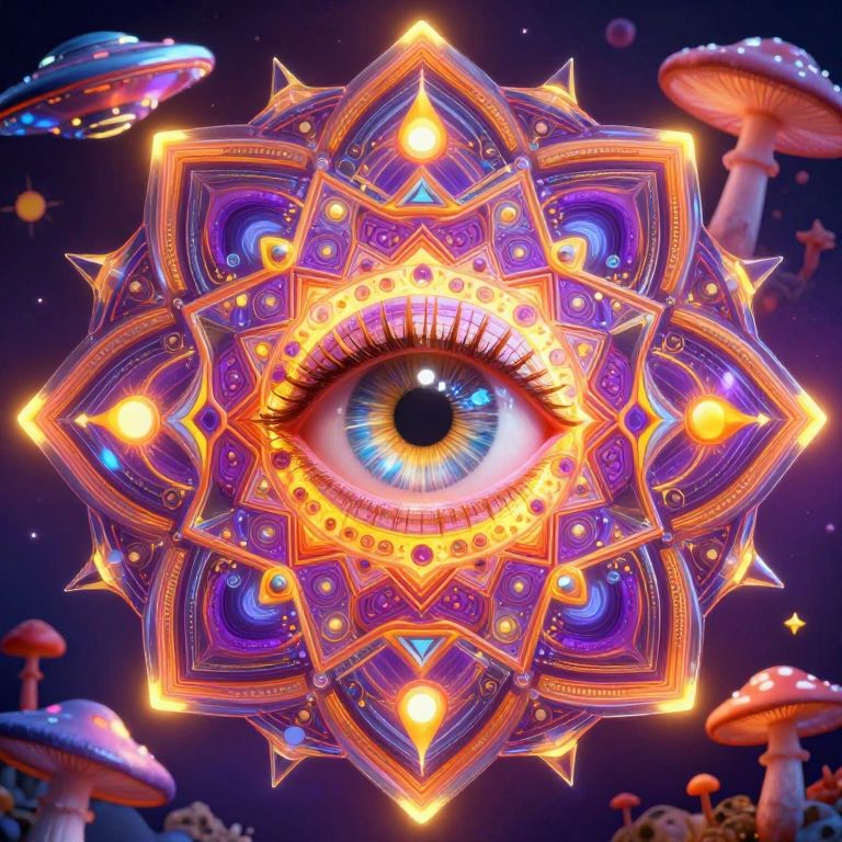 Digital artwork of a glowing, intricate, purple and orange mandala centered on a vivid blue eye, surrounded by floating mushrooms in a dark, starry
