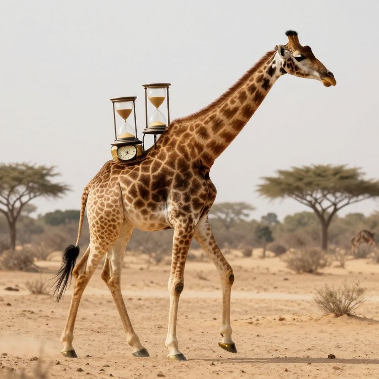 A clockwork giraffe with gears for vertebrae strides patiently across a desert of clocks, winding each one as it passes.
