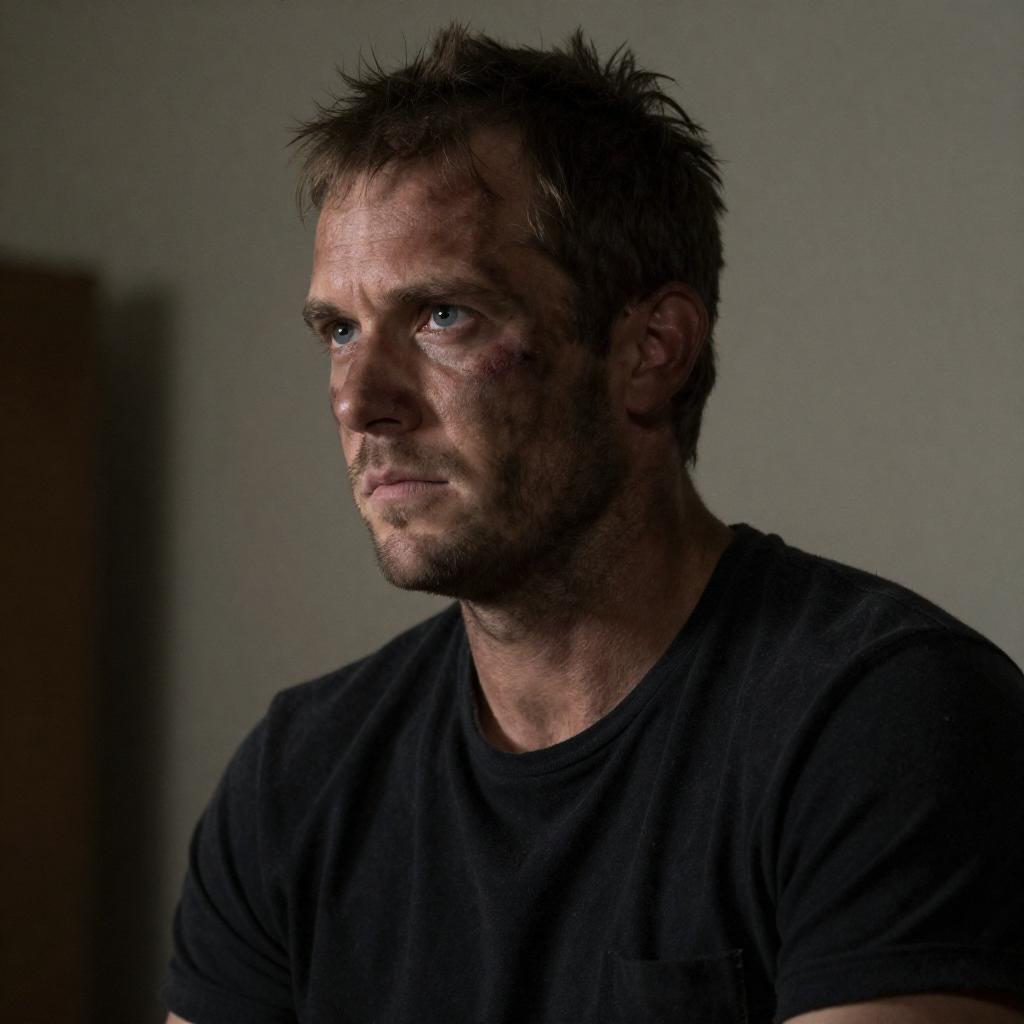 Photograph of a rugged, dirty-faced man with short, messy brown hair and a black t-shirt, looking intently to the side. He has a bruise on his right cheek. The background is blurred, suggesting an indoor setting. The lighting is dim, highlighting his determined expression.