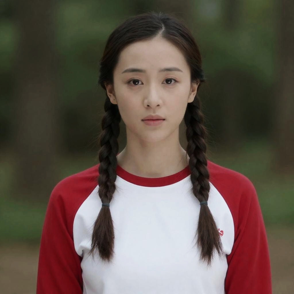 Photograph of a young Asian woman with fair skin and black hair in two braids, wearing a white and red raglan shirt with red sleeves and white torso. She has a neutral expression and is standing against a blurred, green forest background. Her eyes are dark brown, and she has a small, delicate nose and full lips. The lighting is natural, highlighting her smooth skin and the texture of her hair. The overall style is simple and casual.