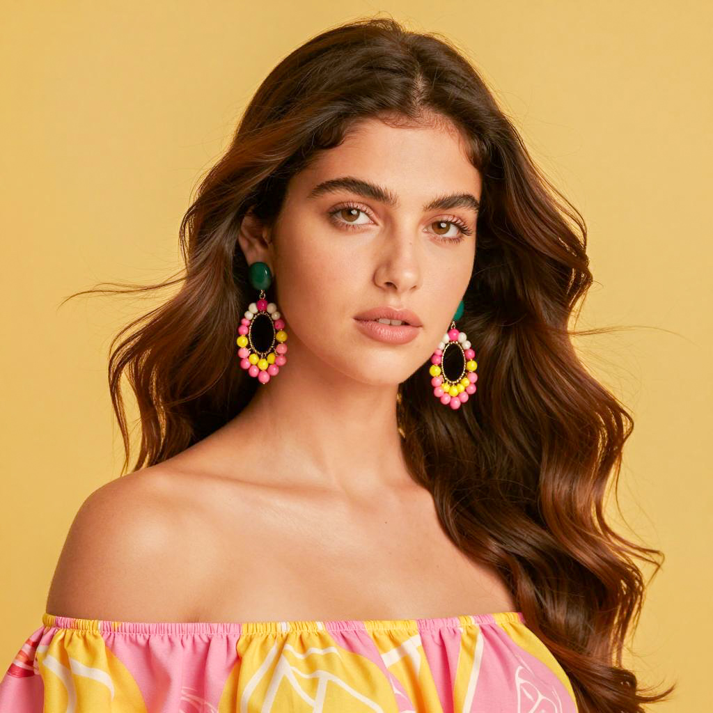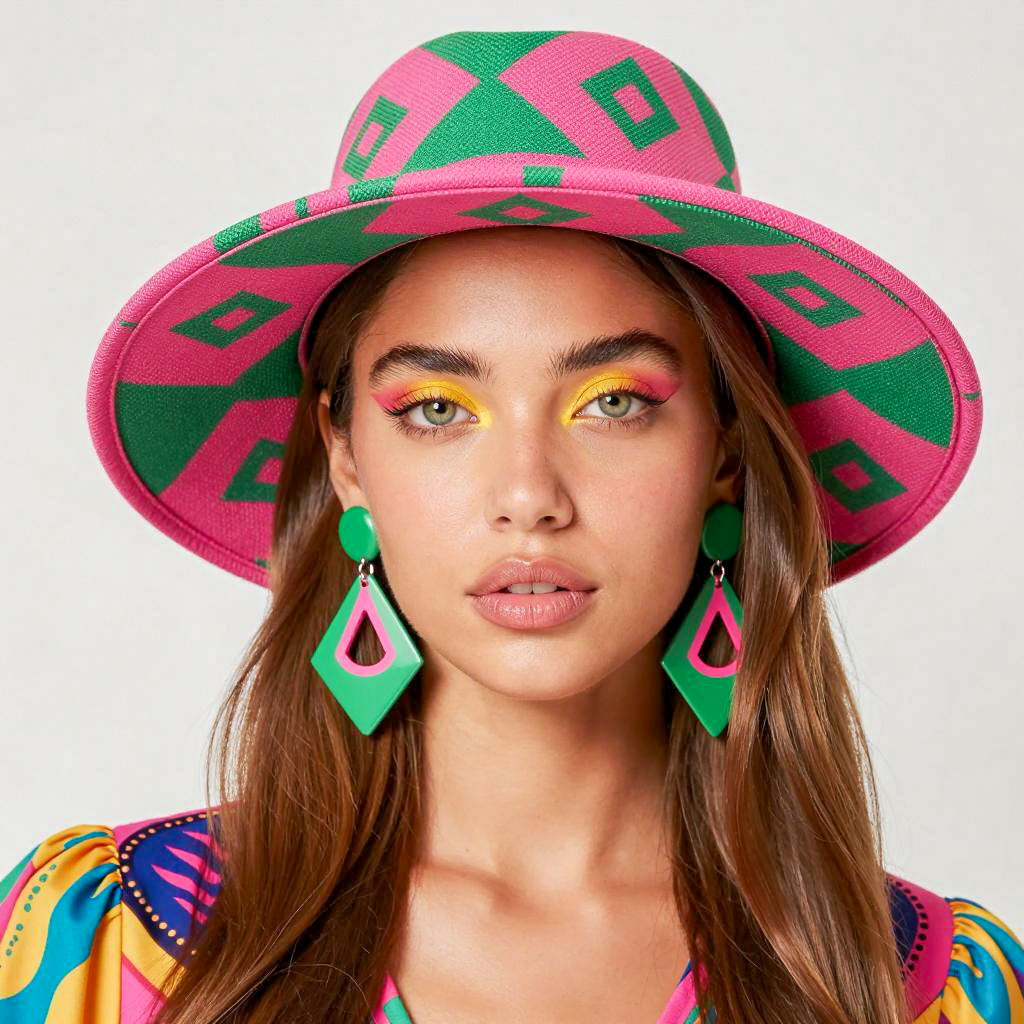 Photograph of a young woman with light brown skin, green eyes, and full lips. She wears a large, colorful hat with bright pink and green patterns, and large green and pink geometric earrings. Her makeup has bold yellow and pink eyeshadow. She has long brown hair and wears a vibrant, patterned top. She looks directly at the camera with a neutral expression. Background is plain white.
