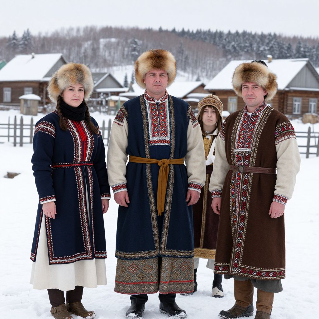 Old Russian clothing, traditional folk costumes with intricate embroidery and vibrant colors, warm fur hats and layered garments, set against a wintry village backdrop with wooden houses and snow-covered trees, detailed textures and historical authenticity.