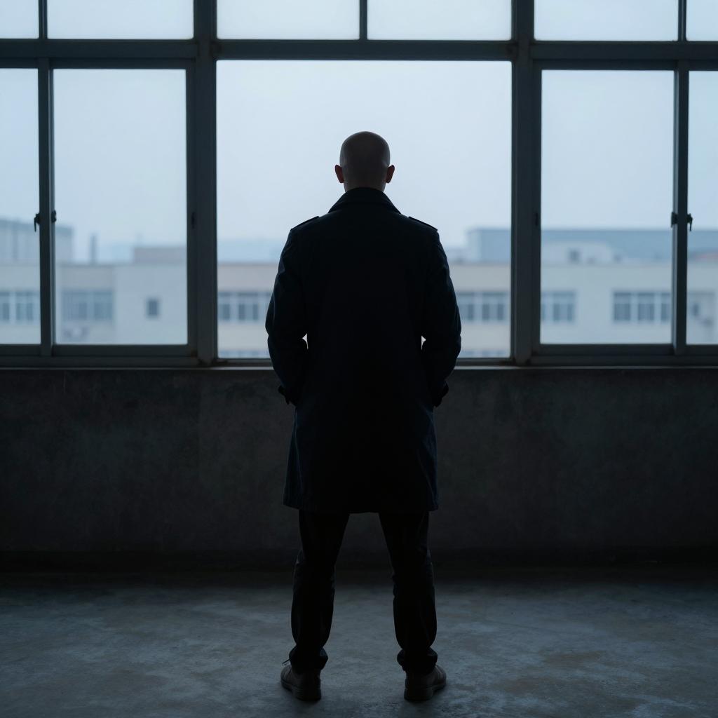 Photograph of a man with short silver-gray hair seen from behind. He is wearing a dark suit with a blue collar, standing in front of a red curtain with metal rods on each side. The image is illuminated by blue lighting focused on the back of the man.