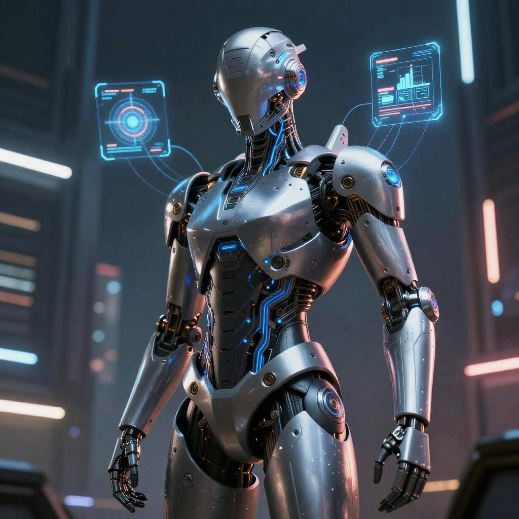 CGI image of a white and black futuristic robot standing in a neon-lit laboratory with holographic targets in the background.