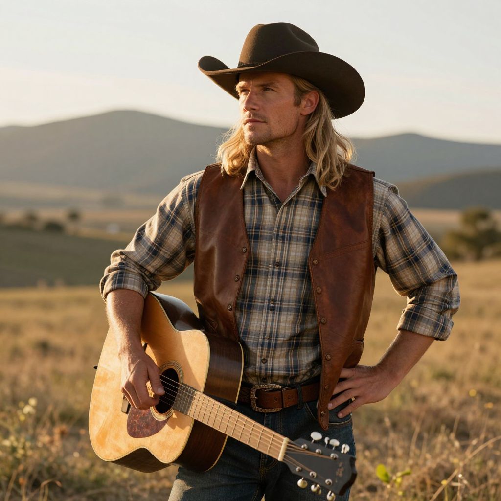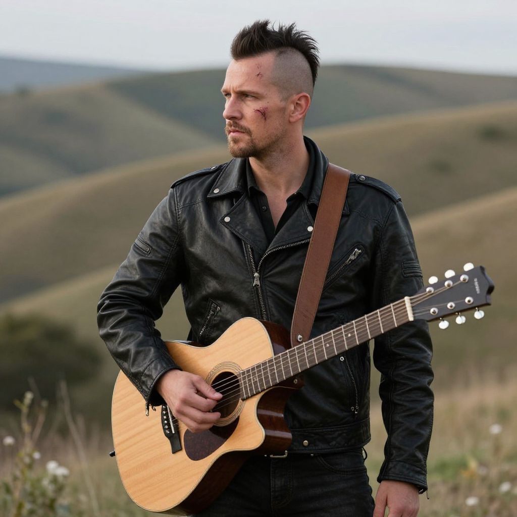 A man with a mohawk, unshaven, and a scar on his cheek, wearing a black leather motorcycle jacket, holds a wooden guitar while standing in a rolling hill landscape.