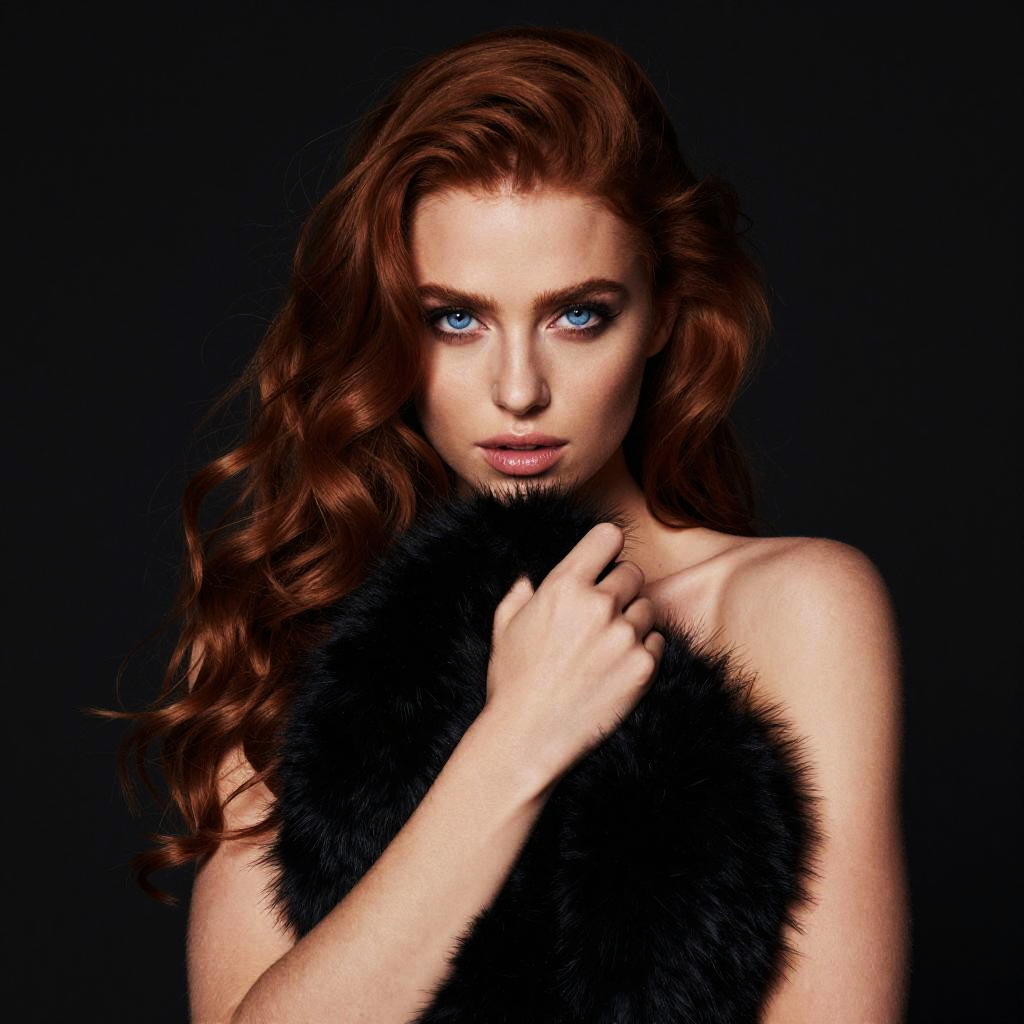 Photograph of a beautiful, light-skinned woman with long, wavy auburn hair and striking blue eyes. She is wearing a black, furry, textured dress that she holds at the front with both hands, partially covering her chest. Her makeup is smoky-eyed with dark eyeliner and nude lipstick. The background is a solid, dark black, which contrasts with her fair skin and the black dress. The lighting is dramatic, highlighting her facial features and the texture of the dress. Her expression is intense and slightly seductive. She has a slender, toned physique.