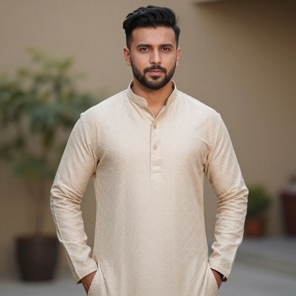 A man, light beige cotton Pathani suit, vibrant red embroidered vest, white churidar pants, soft khussa shoes, tropical oasis, palm trees swaying, crystal-clear water reflecting sunlight, pinhole camera style, relaxed smile, serene expression. Man has masculine face and piercing eyes