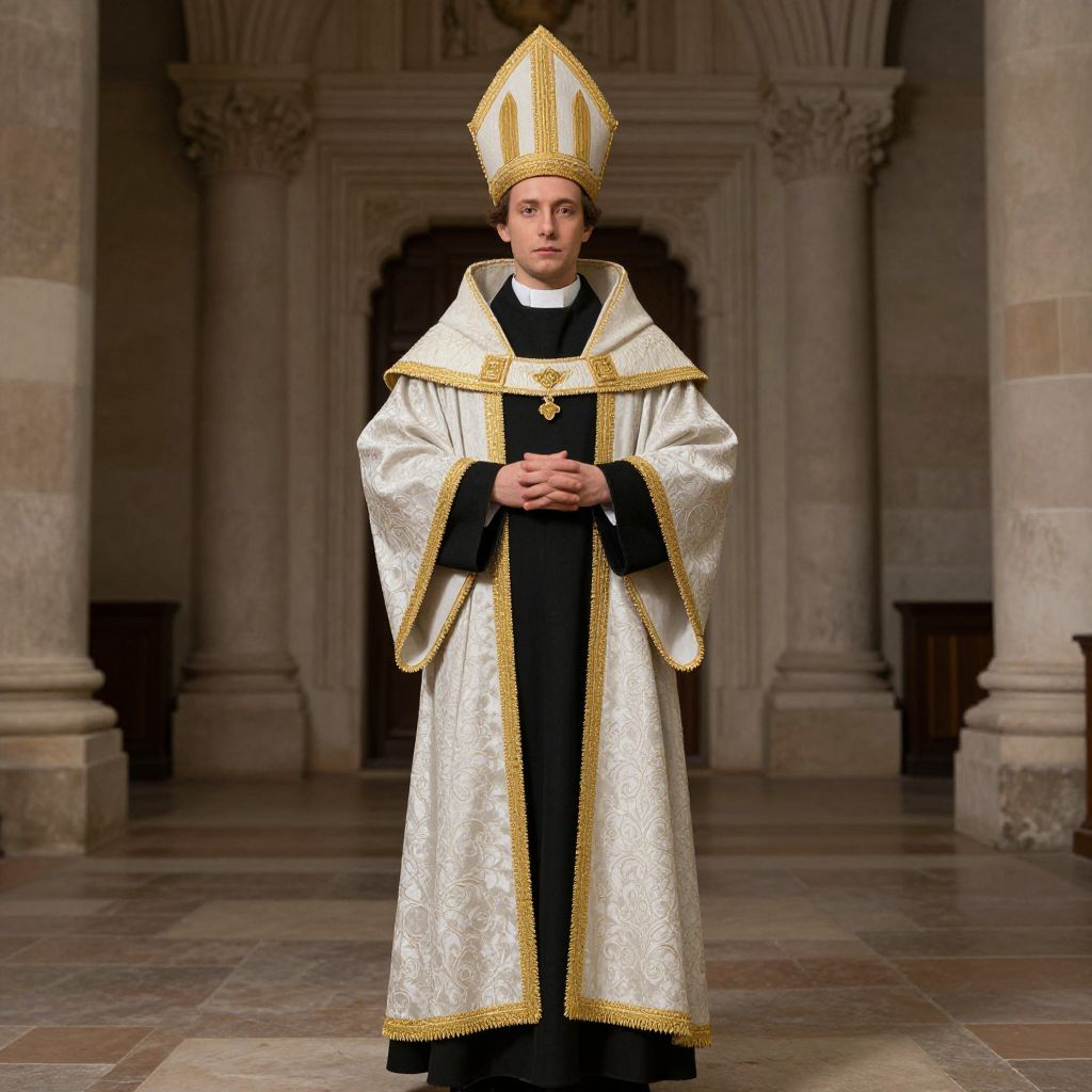 Full-length portrait of a young man dressed in an ornate vicar or bishop costume, including a white robe with gold trim and a matching mitre hat. The background features classical stone architecture with columns, suggesting a church or cathedral setting.
