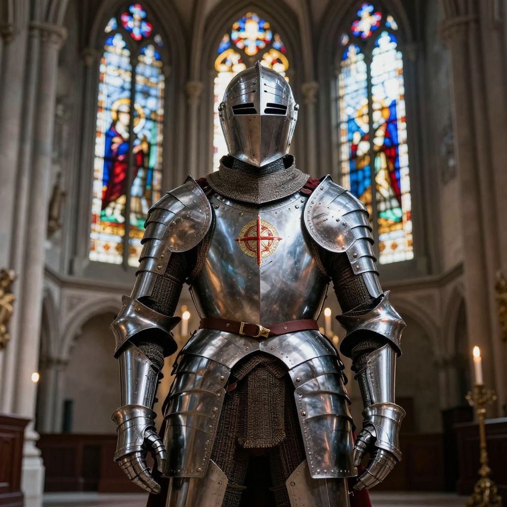 Holy crusader armor worn by a noble knight standing in a grand cathedral, stained glass windows casting colorful light on the highly detailed plate armor, the scene filled with reverence and power, medieval fantasy aesthetic with hyper-realistic details.
