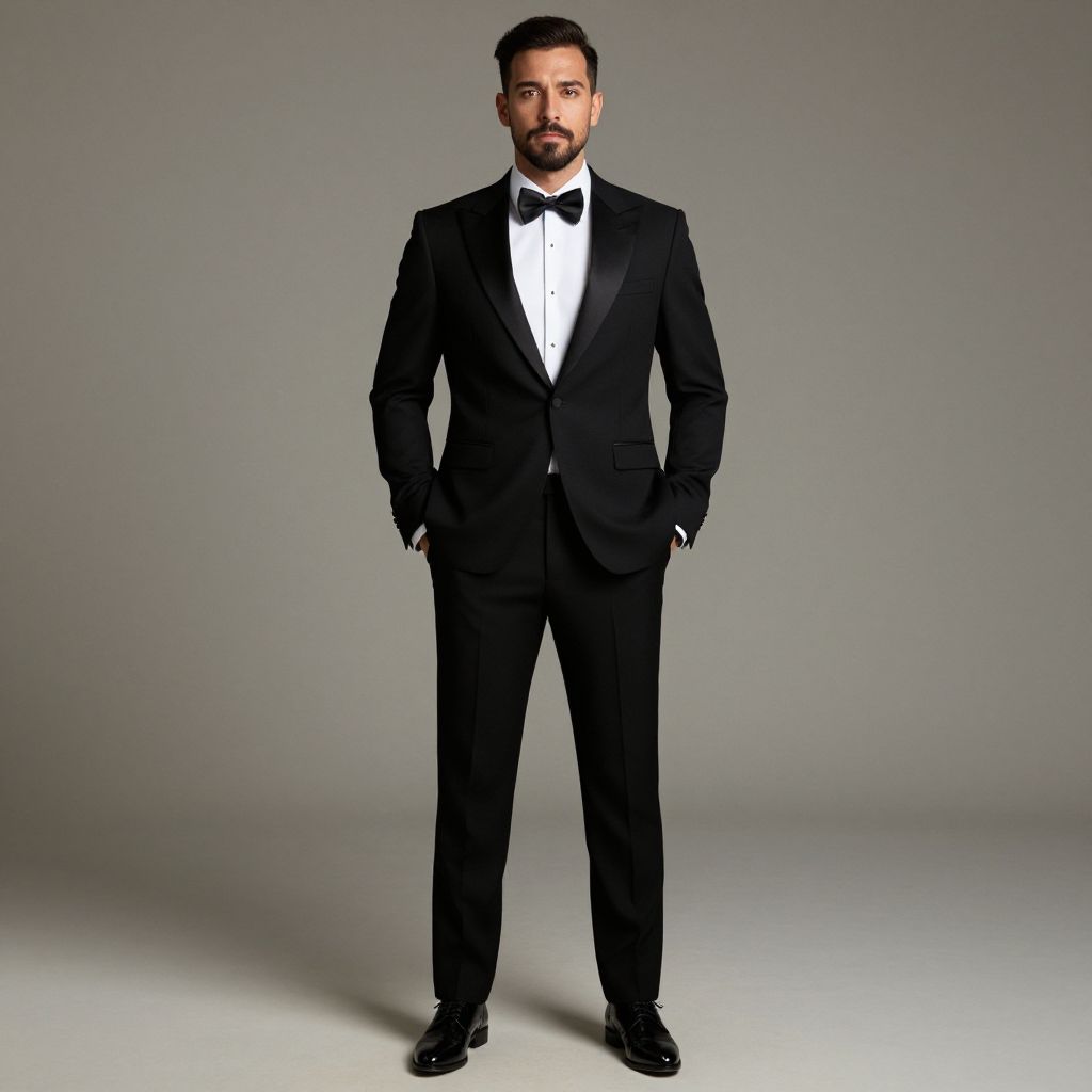 Photograph of a tall, bearded man with short dark hair, standing confidently against a plain grey background. He is wearing a sleek, black tuxedo with a white dress shirt and a black bow tie. His hands are casually placed in his pants pockets, and he is wearing black dress shoes. The tuxedo has a classic cut with a single-breasted jacket and notched lapels. The lighting is even, highlighting the smooth texture of the fabric and the man's well-groomed appearance. The overall style is formal and elegant.