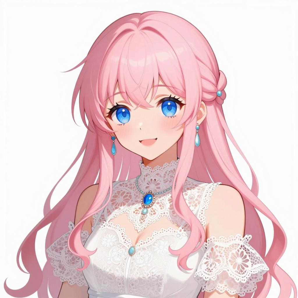 Illustration of an anime girl with long pink hair and blue eyes. She is wearing a detailed white lace dress with floral patterns, a high lace collar, matching earrings, and a pendant. The character has a gentle smile and pink blush on her cheeks.