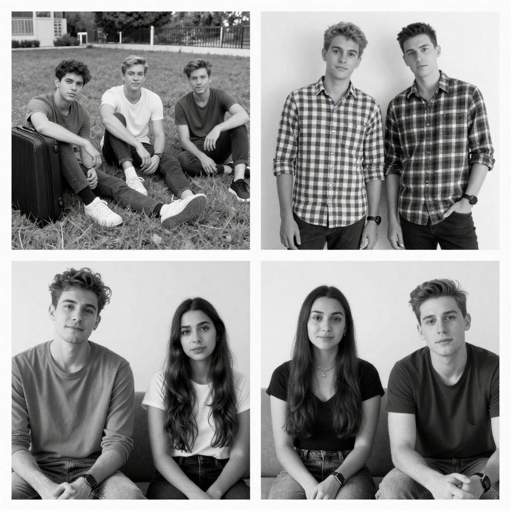 Black-and-white photograph collage of four scenes featuring four young adults. Top left: three men sit on grass, one with a suitcase. Top right: two men stand, one in a checkered shirt. Bottom left: man and woman sit indoors, woman with long hair. Bottom right: woman and two men sit indoors, woman with long hair, one man with short hair. Casual clothing, natural light, indoor and outdoor settings.
