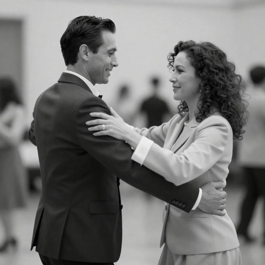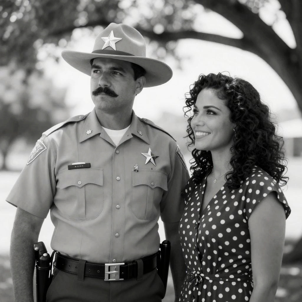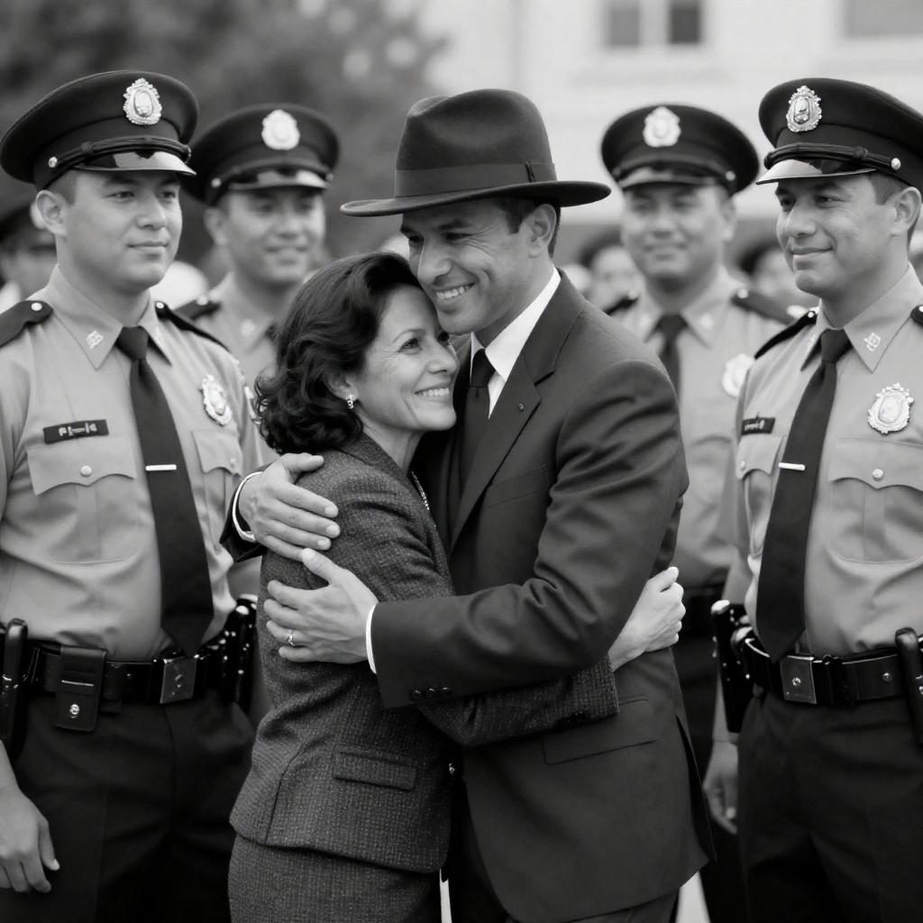 Black and white photograph of a group of people. Central male in suit and hat hugs a woman with dark hair. Four police officers in uniforms surround them. Smiling faces, formal attire. Background includes more people, some with hats.