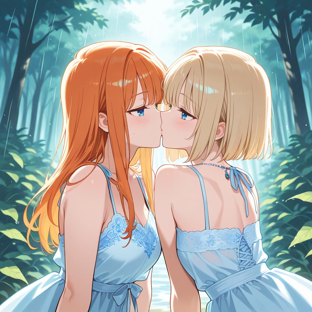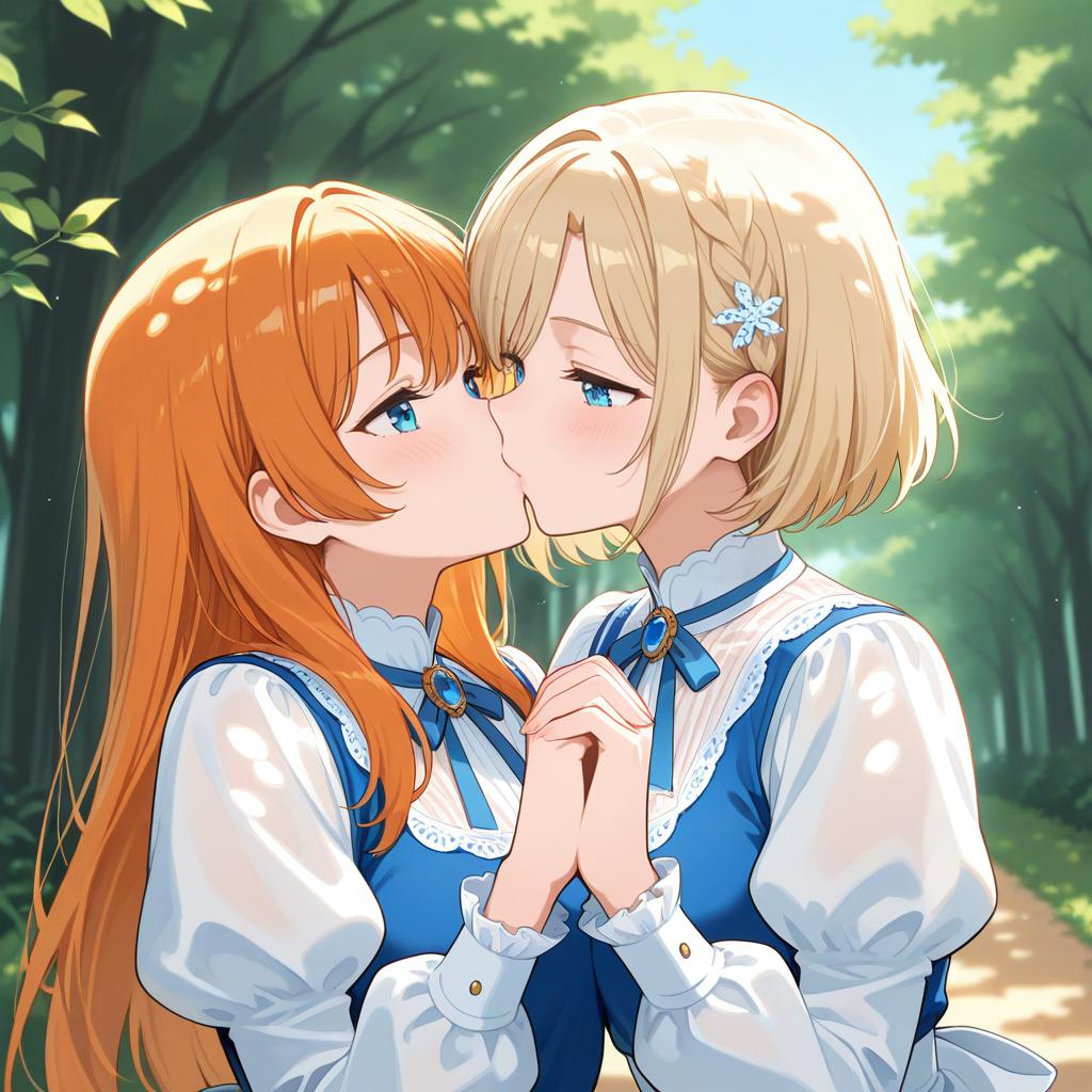 Two girls sharing a tender moment in a passionate kiss, outdoors in a flower-filled meadow in spring. One has short blonde hair with a mole under her mouth, the other sports long orange hair, both with radiant blue eyes. Their unique features include romantic Victorian-inspired dresses, adorned by delicate gold anklets. The scene is highlighted by gentle drifts of snow around them, capturing an intimate expression of affection and connection.