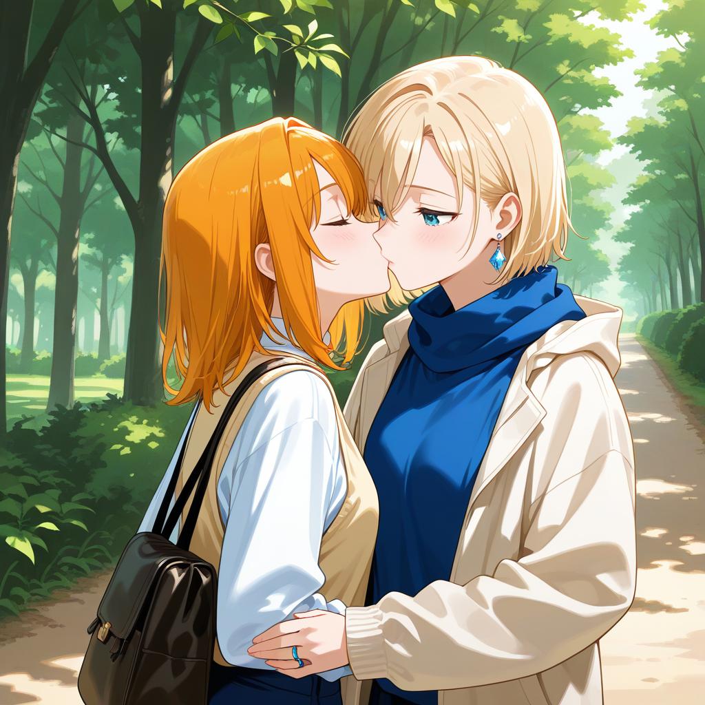 Two Girls Sharing a Tender Kiss in Flower Meadow