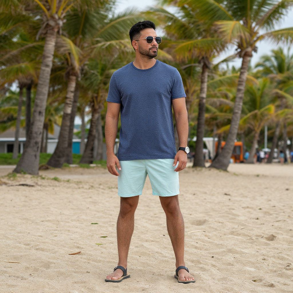 An artistic portrait of a man standing on a sandy beach with palm trees in the background, showcasing a casual yet vibrant summer style.