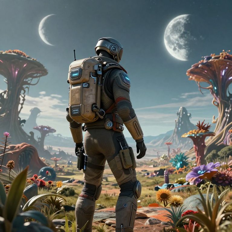 Digital artwork of a futuristic astronaut with a backpack, standing in a vibrant alien landscape with colorful flora, two crescent moons, and strange, towering plants