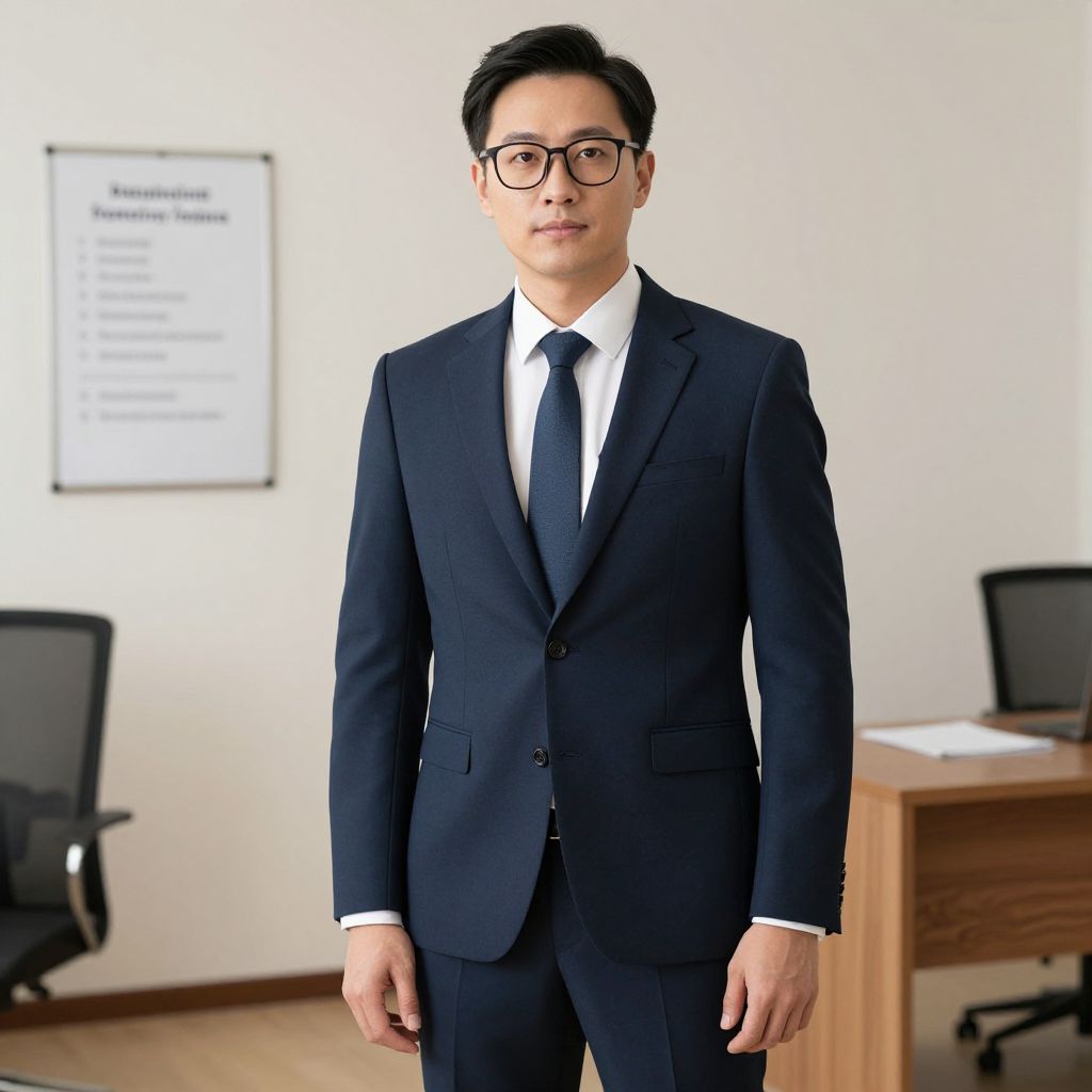 Photograph of an Asian man in his late 20s to early 30s standing in a modern office. He has short, black hair and wears black-rimmed glasses. He is dressed in a dark blue, well-fitted suit with a white dress shirt and black tie. The background features a white wall with a framed document titled "Employee Terms" on the left, a wooden desk with a computer on the right, and a black office chair partially visible on the left. The office has a light wooden floor and a minimalist design. The man has a neutral expression and stands upright, facing the camera.