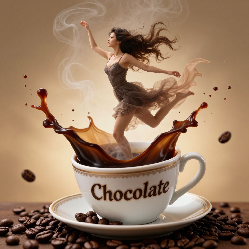 Digital artwork depicting a small, detailed statue of a regal woman with a crown, ornate dress, and flowing hair, emerging from a large, white, ornate teacup with a matching saucer. The statue has one arm raised and a serene expression. The teacup and saucer have intricate gold patterns. The background is dark with subtle textures. A white, cylindrical object rests on the saucer's edge. The overall style combines realism with a surreal, whimsical twist, emphasizing contrast between the delicate porcelain and the detailed statue.