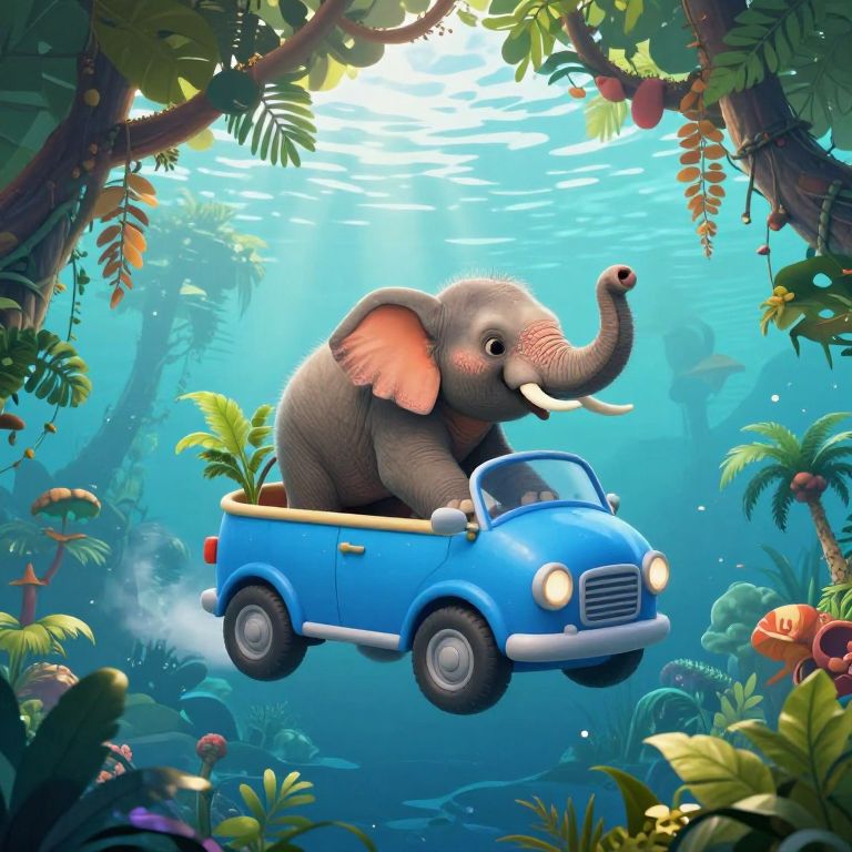 An enchanting journey of wonder unfolds as a joyful young elephant navigates a sky-blue vehicle through an ethereal, upside-down jungle suspended beneath the ocean's serene embrace, where the boundaries of reality blur into a dreamlike realm of freedom and imagination.