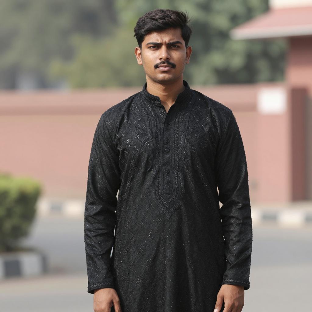 Blue cape adult, photograph of a young man with short dark hair, mustache, wearing a blue hooded coat over a light blue button-up shirt, standing outdoors, background with blurred trees and greenery, daytime, soft natural light, slightly serious expression, casual style, medium close-up shot, realistic, slightly warm color tones, slight shadow on the right side, green and brown colors in the background