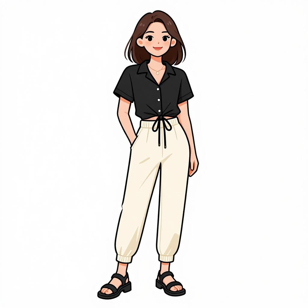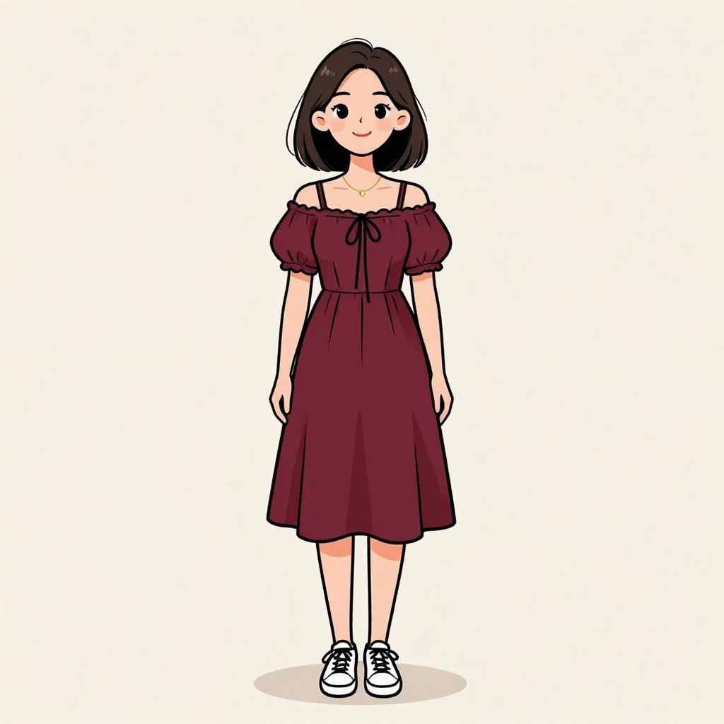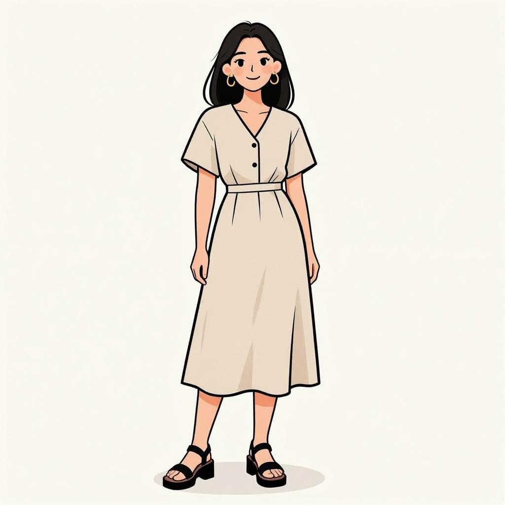Woman with pretty face and pretty hair. smiling Woman, minimalist, relaxed-fit midi dress in a neutral beige tone, V-neckline, short dolman sleeves, functional button placket down the front, two discreet side pockets, calf-length with a subtle A-line silhouette, paired with chunky black platform sandals, accessorized with simple gold hoop earrings, studio background with a clean and bright appearance. --sref 1467