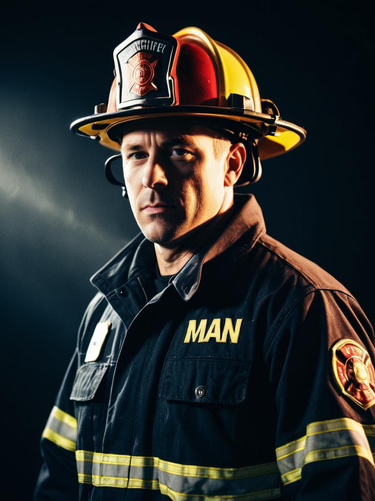 Man in Firefighter costume, studio headshot with cinematic shadows