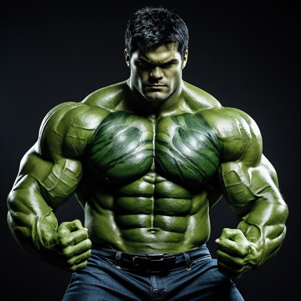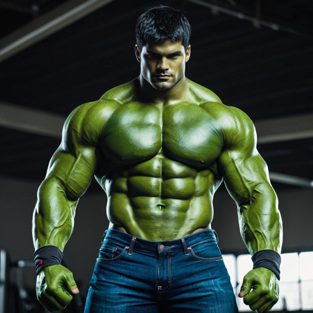 Hulk costume gloves ,1boy, male focus, green skin, muscular, denim, jeans, colored skin, topless male, abs, muscular male, pants, solo, pectorals, nipples, black hair, blurry background, bara, navel, looking at viewer, large pectorals, short hair, blurry